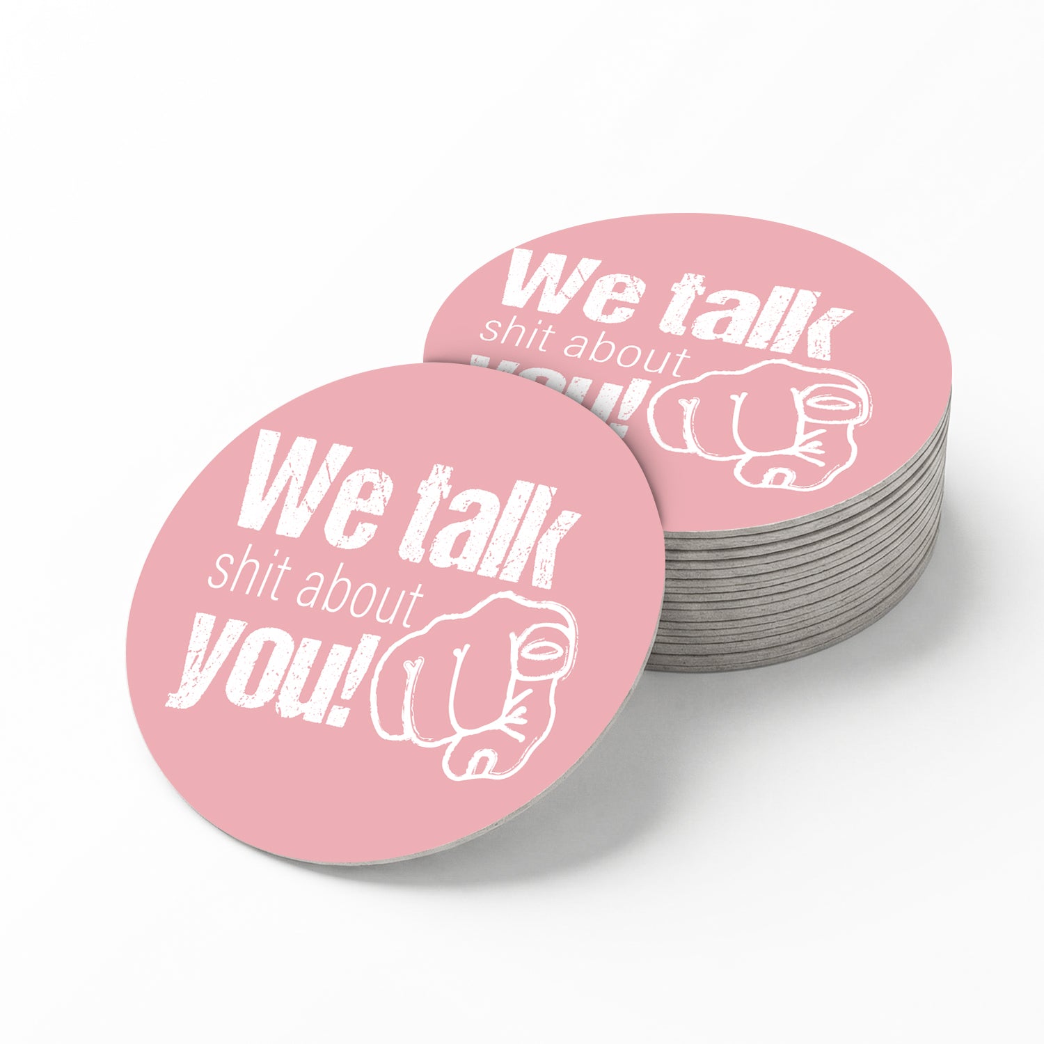Mit dem provokanten Statement „We talk shit about you“ auf zartrosa Hintergrund sorgt dieses Design garantiert für Gesprächsstoff. Die Kombination aus softer Farbe und derbem Spruch macht den Bierdeckel zum absoluten Hingucker – perfekt für JGA, Geburtstage oder jede Party mit einer ordentlichen Portion Humor.
